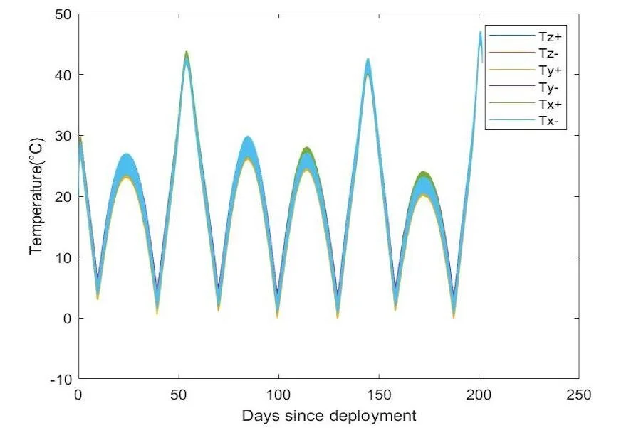 To ensure this would not be the case, a multi-node transient thermal analysis was carried out on STRATHcube to measure the variation in temperature on each of the CubeSat surfaces throughout the mission. With the simple aluminium structure, it was found in this preliminary stage of analysis that no surface coating or insulation was required to maintain the CubeSat in its operational ranges.