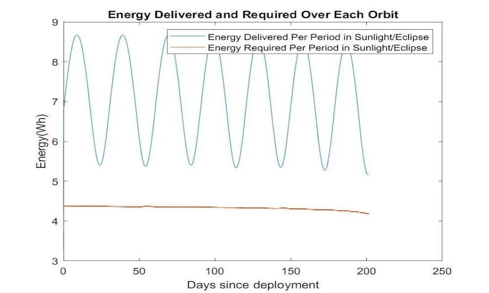 For this configuration, simulations were carried out to confirm that the deployed solar panels could meet the power needs of the CubeSat for the entire mission lifetime. The solar panels currently selected at this stage of the project are the ISIS (Innovative Solutions in Space) 2U Solar panels, providing a maximum of 4.6W per panel. The results of the simulations proved this solar panel configuration could provide sufficient power over the full mission lifetime.