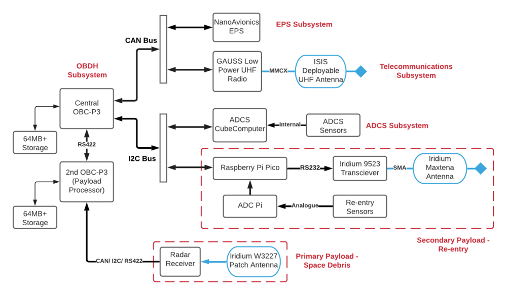 STRATHcube’s OBC is required to interface with all subsystems, as shown in the avionics architecture. It is also required to carry out the data processing and storage relating to the Primary Payload space debris experiment.